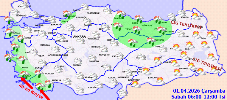 - Kuvvetli Yağış: Marmara’nın batısı (Edirne, Çanakkale, Kırklareli), Kıyı Ege ve Batı Akdeniz genelinde yerel kuvvetli sağanaklar görülecek.