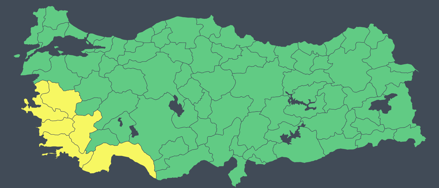 Sarı kodlu uyarı yapılan iller; Ankara, Denizli, Manisa, Aydın, İzmir ve Muğla. Bu şehirlerde gök gürültülü sağanak yağış bekleniyor.