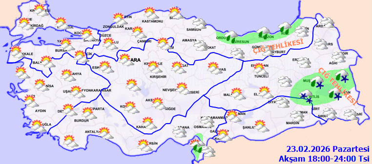 Kars, Ağrı, Ardahan, Muş, Van ve Bitlis çevrelerinde karla karışık yağmur ve kar görülecek. Sabah ve gece saatlerinde don ve buzlanma etkili. Erzurum 5°C, Kars 4°C, Van 9°C, Malatya 12°C.