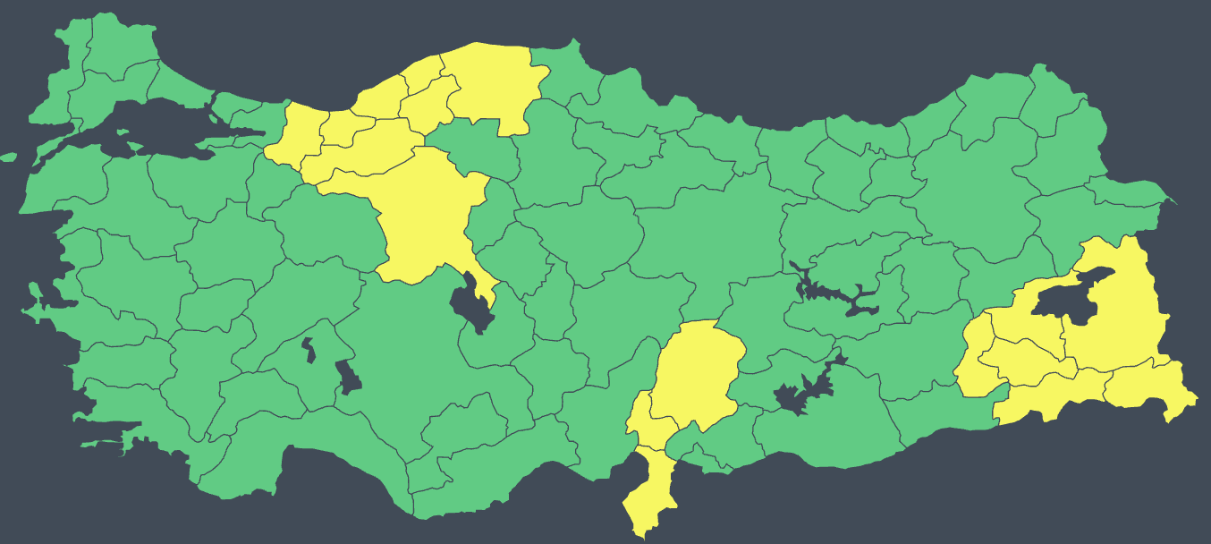 Sarı kod uyarısı verilen iller şöyle; Ankara, Bolu, Hatay, Kahramanmaraş, Siir, Zonguldak, Şırnak, Karabük, Düzce, Bitlis, Hakkari, Kastamonu, Sakarya, Van, Batman, Bartın ve Osmaniye.