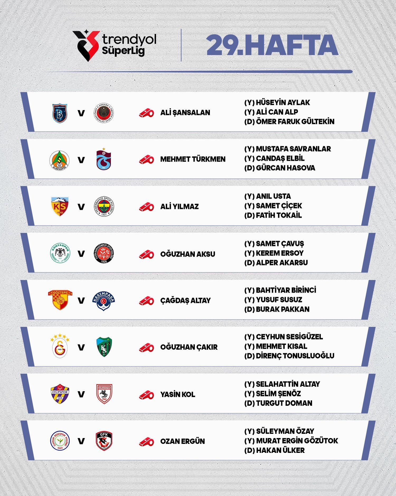 Trendyol Süper Lig'de şampiyonluk yarışı ve ligde kalma mücadelesi tüm hızıyla sürerken, 29. haftada oynanacak kritik karşılaşmalarda düdük çalacak hakemler Türkiye Futbol Federasyonu (TFF) Merkez Hakem Kurulu (MHK) tarafından açıklandı.