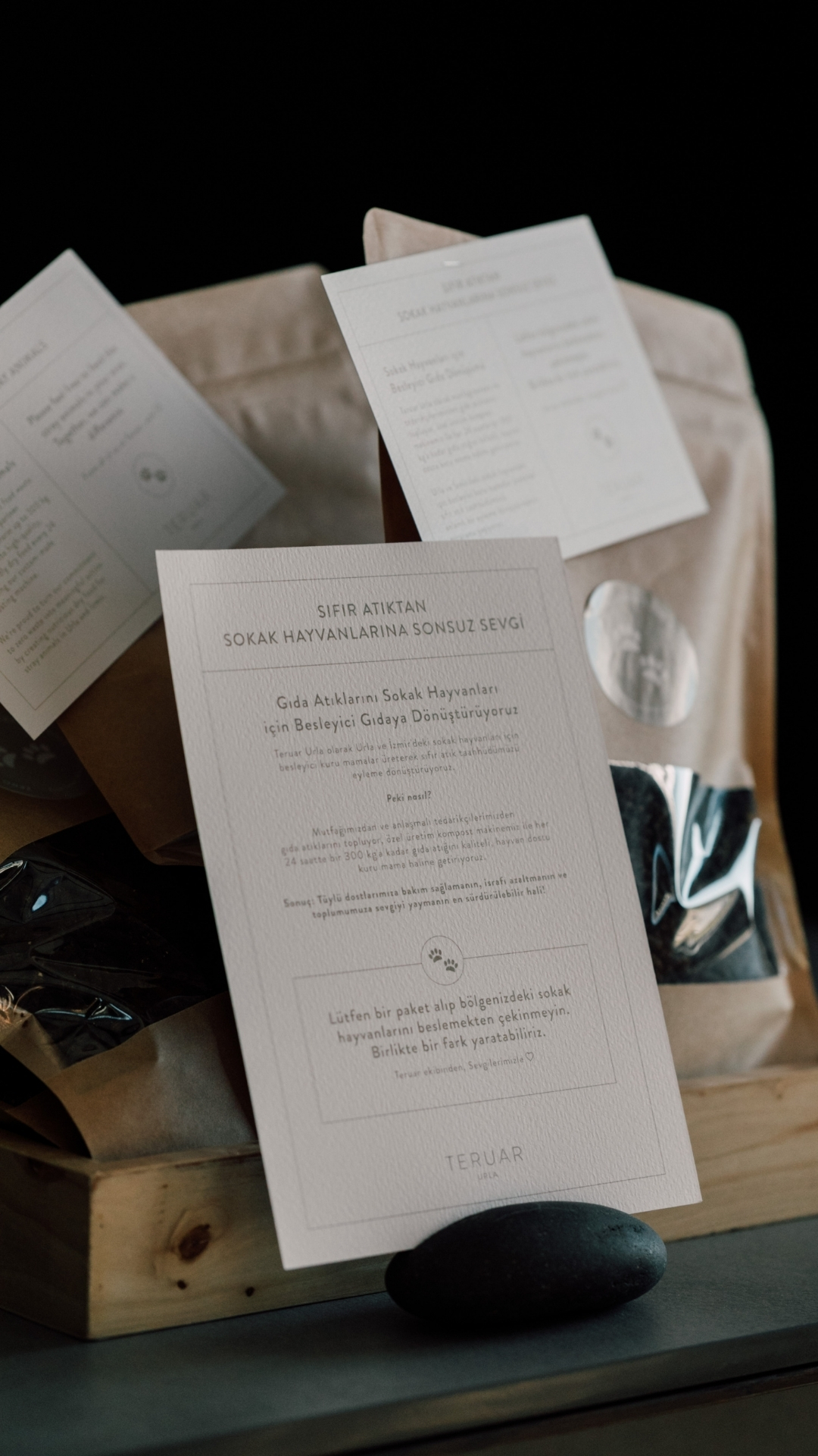 Bu fikir aslında bir anda ortaya çıkmadı. Teruar’da mutfağı ve servisi uzun zamandır sıfır atık prensibiyle çalıştırıyoruz; tadım menüsüyle ilerlediğimiz için zaten kontrollü ve minimal bir atık yapımız var. Buna rağmen, mutfakta kalan sebze parçaları, balık kılçıkları ya da güvenle değerlendirilebilecek bazı artıkların başka bir canlı için besine dönüşebilmesi fikri beni hep düşündürüyordu. Yeni kompost makinemizi kurarken, bu süreci bir adım daha ileri taşıyabileceğimizi fark ettik. Yerli bir firma ve Türk mühendislerle çalışıyor olmak, sistemi ihtiyaçlarımıza göre şekillendirebilmemizi sağladı. Mama üretimine uygun bir yapı kurgulandı ve bu fikir Teruar’ın günlük akışının doğal bir parçası haline geldi.Benim için sokak hayvanlarıyla kurduğum bağ zaten çok kişisel bir yerde duruyor. Ama asıl önemli olan, bu duyarlılığı bireysel bir hassasiyet olmaktan çıkarıp Teruar’ın döngüsüne dahil edebilmekti. Burada her şeyin bir yere değmesini, her parçanın anlamlı bir karşılığı olmasını önemsiyorum. Mama üretimi de tam olarak bu yaklaşımın içinden, çok doğal bir şekilde doğdu.