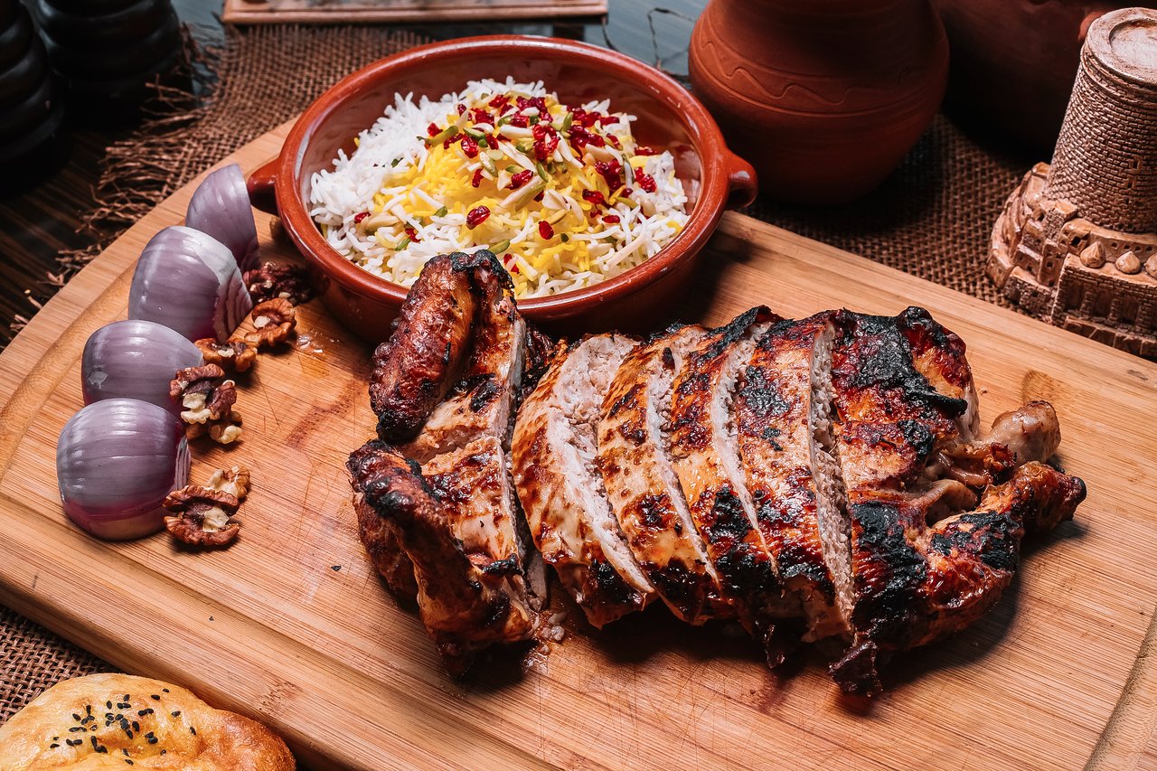 Güney Azerbaycan’a özgü bu yemekte tavuk, balık ya da patlıcan; öğütülmüş ceviz, erik ezmesi, soğan, tuz ve karabiberle doldurulur ve saatlerce tandırda pişirilir. Tek bir tabakta dumanlı kabuk, kavrulmuş ceviz ve tatlı-ekşi iç harç gibi pek çok doku ve lezzet bir araya gelir. Özellikle balıkla yapıldığında etkisi daha da güçlüdür. Hiele bu ürünün lezzetinin çok katmanlı olduğunu, farklı ürün kombinasyonlarıyla beklenmedik tatlar elde ettiğini söylüyor.
