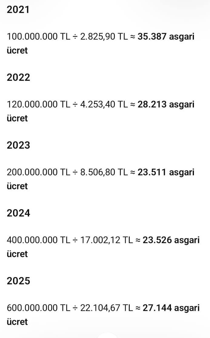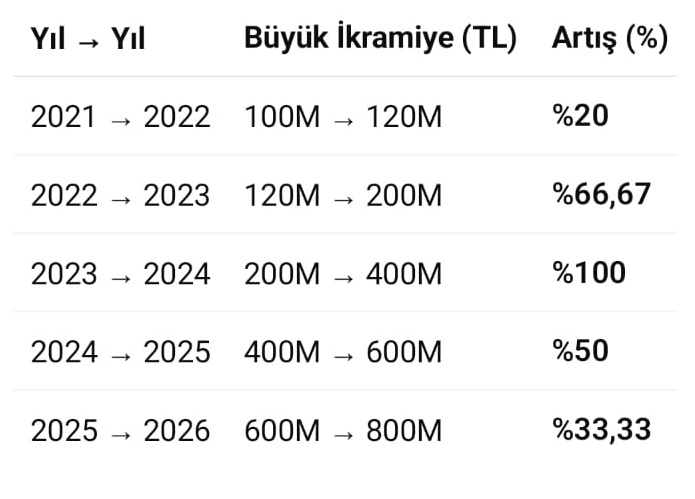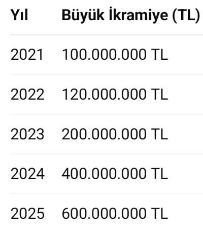 2021’de büyük ikramiye 100 milyon lirayken, 2022’de bu rakam 120 milyona çıktı. 2023’de büyük ödül 200 milyon lirayken, 2024’de 400 milyon liraya, 2025’de 600 milyon liraya bu sene de 800 milyon liraya çıktı.
