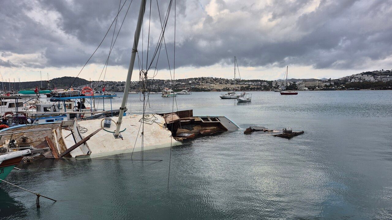 Yarı batık durumdaki teknenin bazı kısımlarının parçalandığı ve denize saçıldığı gözlendi. Su üzerindeki tahta parçaları arasında bir tüpün olduğu da dikkat çekti.