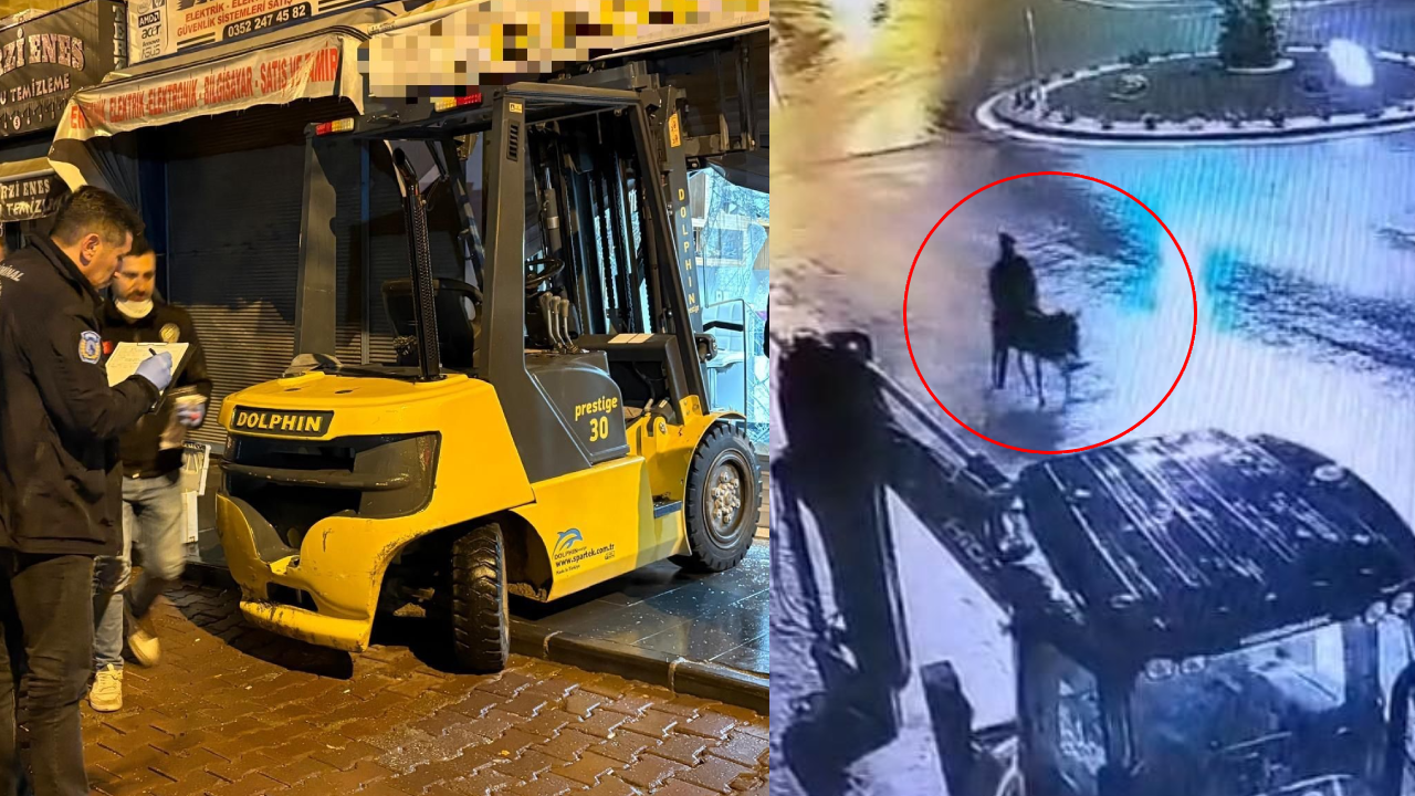 Öte yandan, hırsızın forkliftle kuyumcu dükkanının kepengini kırdığı ve tezgahı devirdikten sonra altınları alarak kaçtığı anlar kameralara yansıdı. Şahsın hırsızlık sırasında bere ve cerrahi maskeyle yüzünü gizlediği anlar da saniye saniye kaydedildi.