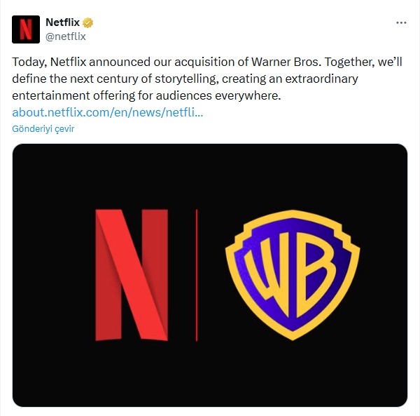 Netflix, Warner Bros.’u satın aldığını sosyal medya hesabından "Birlikte, hikaye anlatımının gelecek yüzyılını tanımlayarak, dünyanın her yerindeki izleyiciler için olağanüstü bir eğlence içeriği oluşturacağız." ifadeleri ile duyurdu.