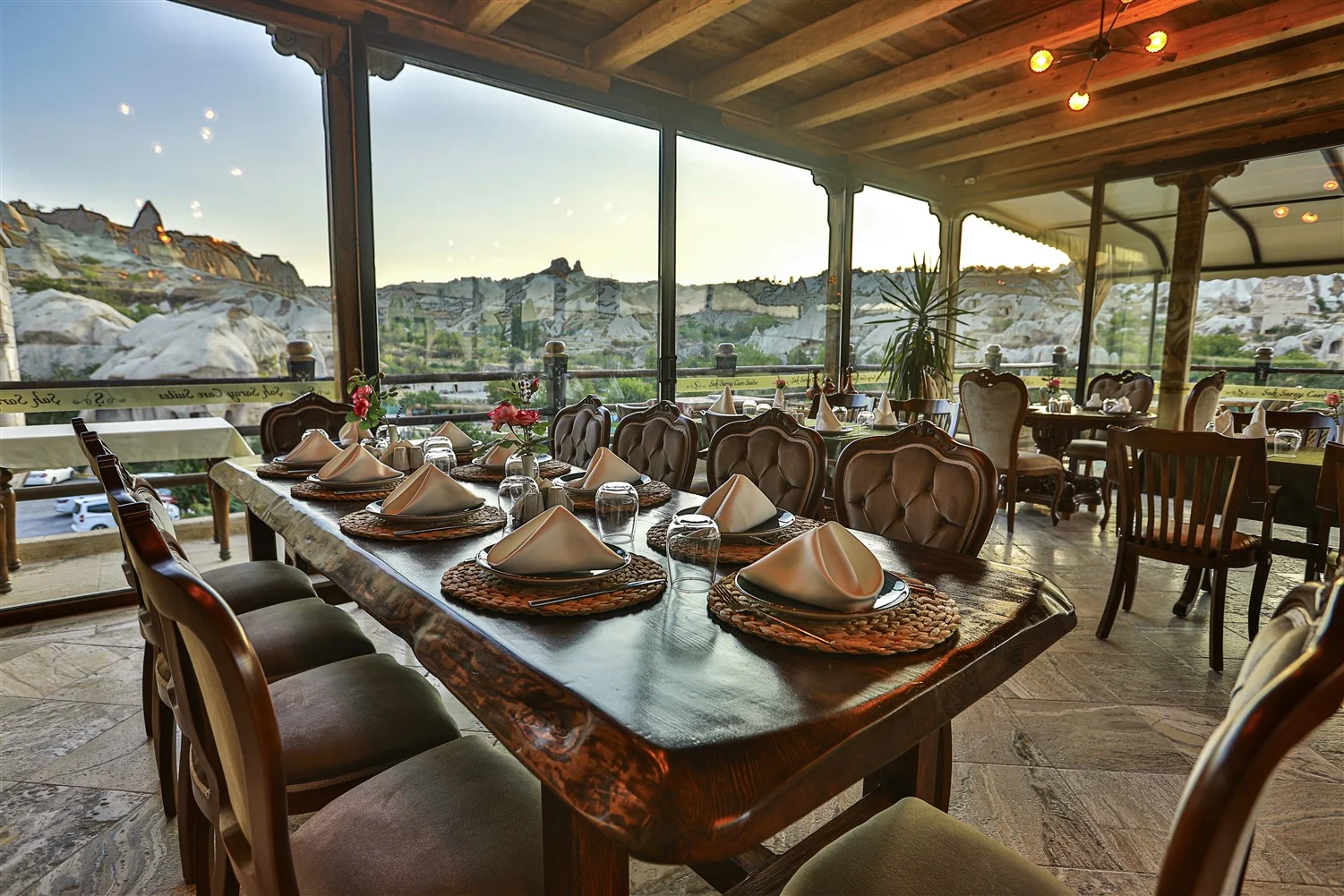 Şah Saray Cave Suites’in manzaralı katında yer alan bu samimi restoran, misafirlerini ikramlıklar ve sıcak bir konukseverlikle karşılıyor. Helal ürünlerle hazırlanan menüsü, Türk ve İslam mutfak mirasına saygı duruşu niteliğinde; özellikle güveç yahni gibi dengeli ve zarif lezzetler öne çıkıyor. Vadi manzarası eşliğinde keyifli bir deneyim sunan mekânda kıyafet düzenine dikkat edilmesi gerekiyor.
