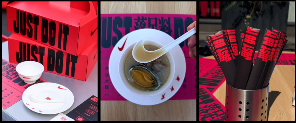 Nike, Çin’in Guangzhou kentinde Ersha Adası’nda koşu kültürüne özgü ve dikkat çeken bir pop-up çorbacı açtı. Marka, Kanton kültüründeki yaşam enerjisi simgesi çorba ritüelini kullanarak küresel "Just Do It" sloganını yerel dayanıklılık ve dayanışma anlayışıyla birleştirdi ve koşuculara ürün yerine sosyalleşebilecekleri, küçük ve keyifli bir mola alanı sundu.