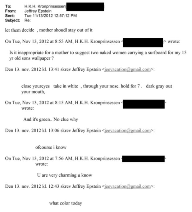 Dava dosyalarındaki en tuhaf detaylardan biri de Prenses'in ebeveynlik tavsiyesi. Mette-Marit, Epstein'e e-posta atarak 15 yaşındaki oğlu Marius’un odasına çıplak kadın resimleri asmak istediğini, bunun bir sakıncası olup olmadığını soruyor. Epstein ise "Bırak çocuk kendisi karar versin, sen karışma" diye cevap veriyor.