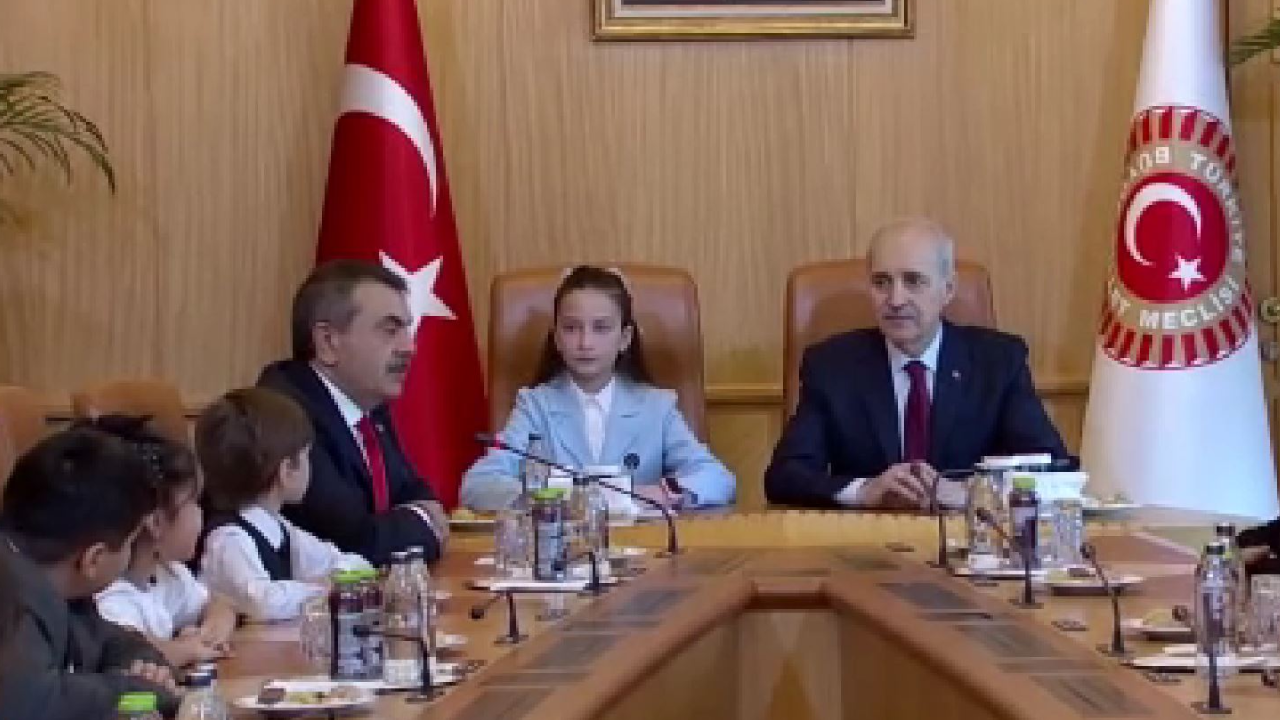 TBMM Başkanı Numan Kurtulmuş, 23 Nisan Ulusal Egemenlik ve Çocuk Bayramı nedeniyle Milli Eğitim Bakanı Yusuf Tekin ve beraberindeki öğrencileri TBMM Başkanlık Divan Salonu’nda kabul etti.