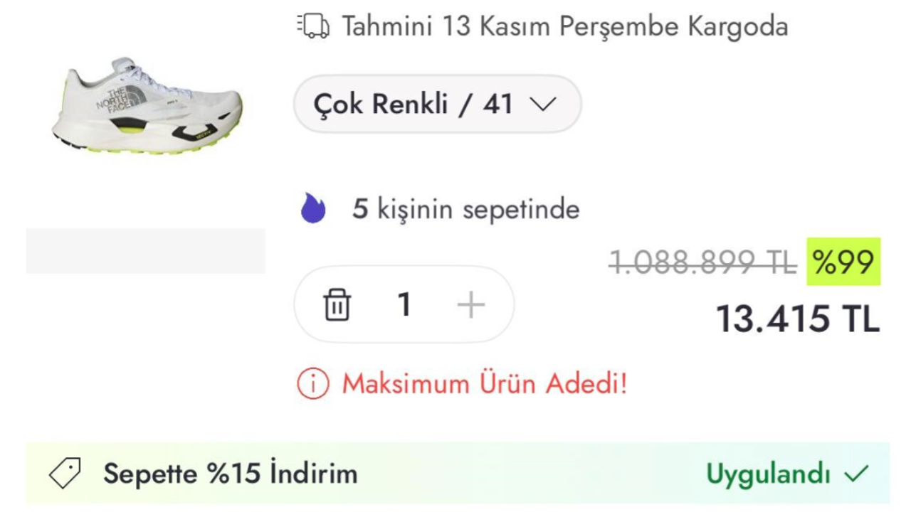 Bir online alışveriş sitesinde 11.11 indirimlerinde bu kez kampanyanın dozu kaçtı. Fiyatı 1 milyon 88 bin lira gösterilen ayakkabının fiyatı, yüzde 99 düşürülerek 13 bin 415 liraya indirilmiş gibi gösterildi.