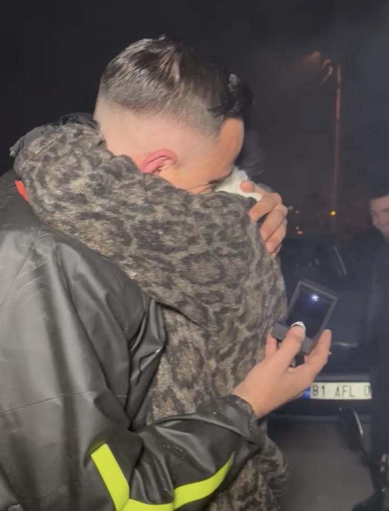 Sevgilisini telefonla arayarak kaza yaptığını söyleyen Eski, Elif Ceylan’ın kısa sürede panik ve endişe içinde olay yerine gelmesini sağladı. Olay yerine ulaşan Ceylan, sevgilisi yerde yattığı esnada gazetecilere de çekmemeleri için tepki gösterdi. Genç kadın bir an olsun başından ayrılmadığı sevgilisinin arkadaşları meşaleler ile alana girince, kendisine sürpriz evlilik teklifi geldiğini fark etti. Evlilik teklifi karşısında duygusal anlar yaşayan Elif Ceylan, hem korku hem de mutluluğu aynı anda yaşadı. Onur Eski’nin evlenme teklifini kabul eden Ceylan, çevrede bulunanların alkışları arasında mutluluğunu paylaştı.