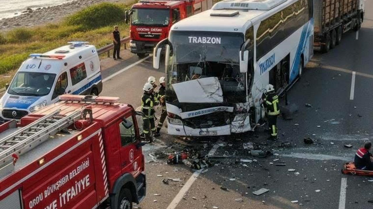 Kaza, Cevizdere Mahallesi Samsun-Karayolu üzerinde meydana geldi. Edinilen bilgiye göre, Muğla’nın Fethiye ilçesinden Trabzon’a giden Zekai Ş. yönetimindeki 61 S 1216 plakalı otobüs, Samsun’dan Ordu’ya alçı taşıyan Uysal B. yönetimindeki 70 ADU 598 plakalı tıra çarptı.