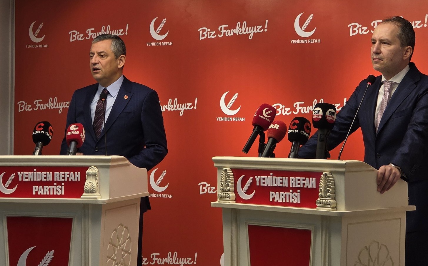 CHP Genel Başkanı Özgür Özel, Yeniden Refah Partisi’nin 3’üncü Olağan Büyük Kongresi’nde yeniden genel başkan seçilen Fatih Erbakan’ı ziyaret etti. Ziyaretin ardından iki lider ortak basın toplantısı düzenledi.