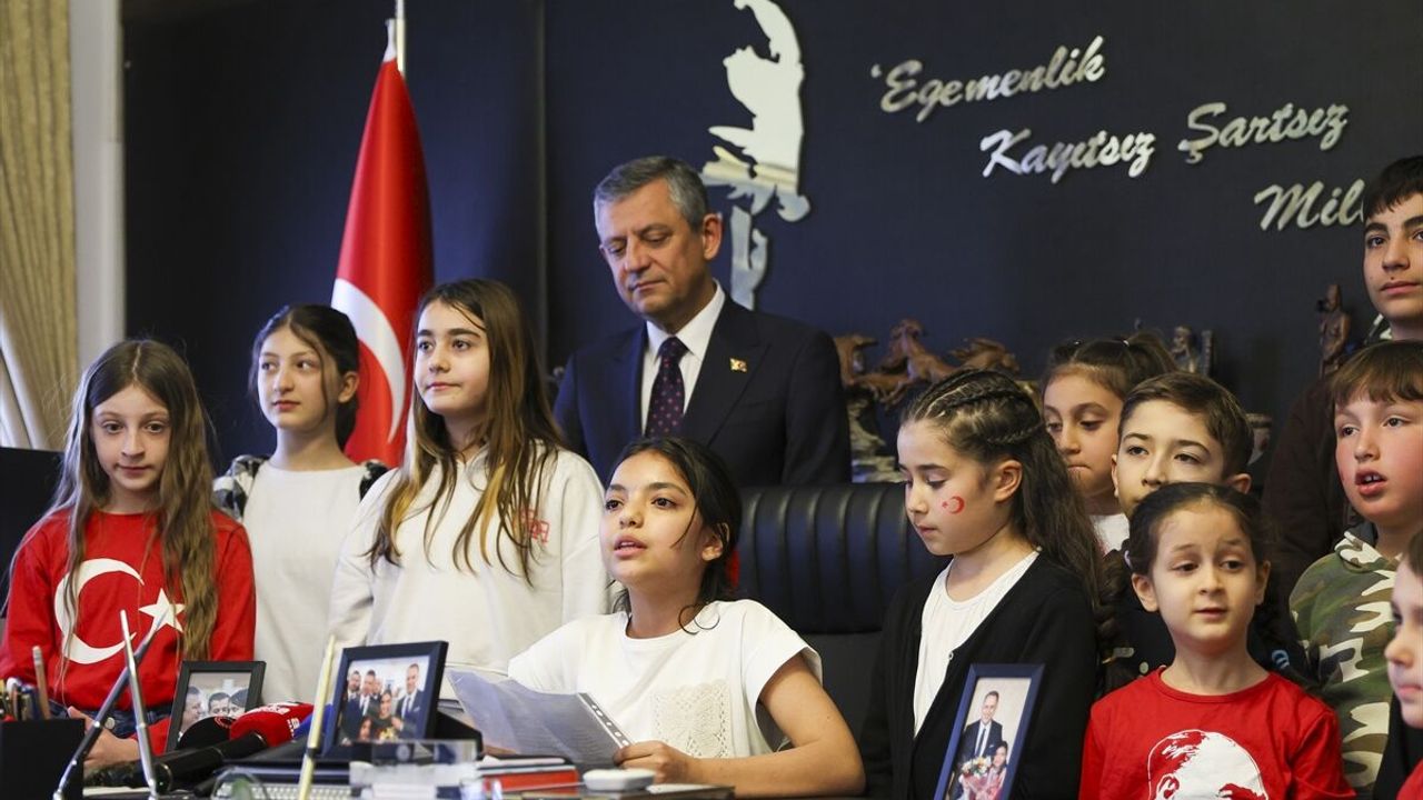 CHP lideri Özgür Özel, Türkiye Büyük Millet Meclisi'nin (TBMM) açılışının 106. yıl dönümü ve 23 Nisan Ulusal Egemenlik ve Çocuk Bayramı vesilesiyle Meclis'teki makamında çocukları misafir etti. Ziyarete gelen çocuklarla tek tek ilgilenen Özel, koltuğunu Hatay'ın Samandağ ilçesinden gelen 5. sınıf öğrencisi depremzede Elisa Dok'a devretti.
