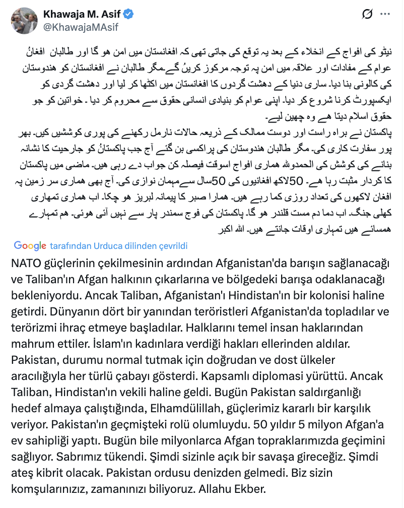 Pakistan Savunma Bakanı Khavaja Muhammed Asıf, X'ten yaptığı paylaşımda, "NATO güçlerinin çekilmesinin ardından Afganistan'da barışın sağlanacağı ve Taliban'ın Afgan halkının çıkarlarına ve bölgedeki barışa odaklanacağı bekleniyordu. Ancak Taliban, Afganistan'ı Hindistan'ın bir kolonisi haline getirdi." ifadelerini kullandı.