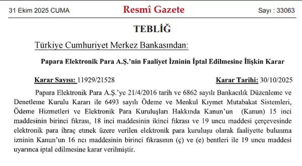Türkiye Cumhuriyet Merkez Bankası (TCMB), Papara'nın faaliyet iznini iptal etti. Karar Resmi Gazete'de yayımlandı.