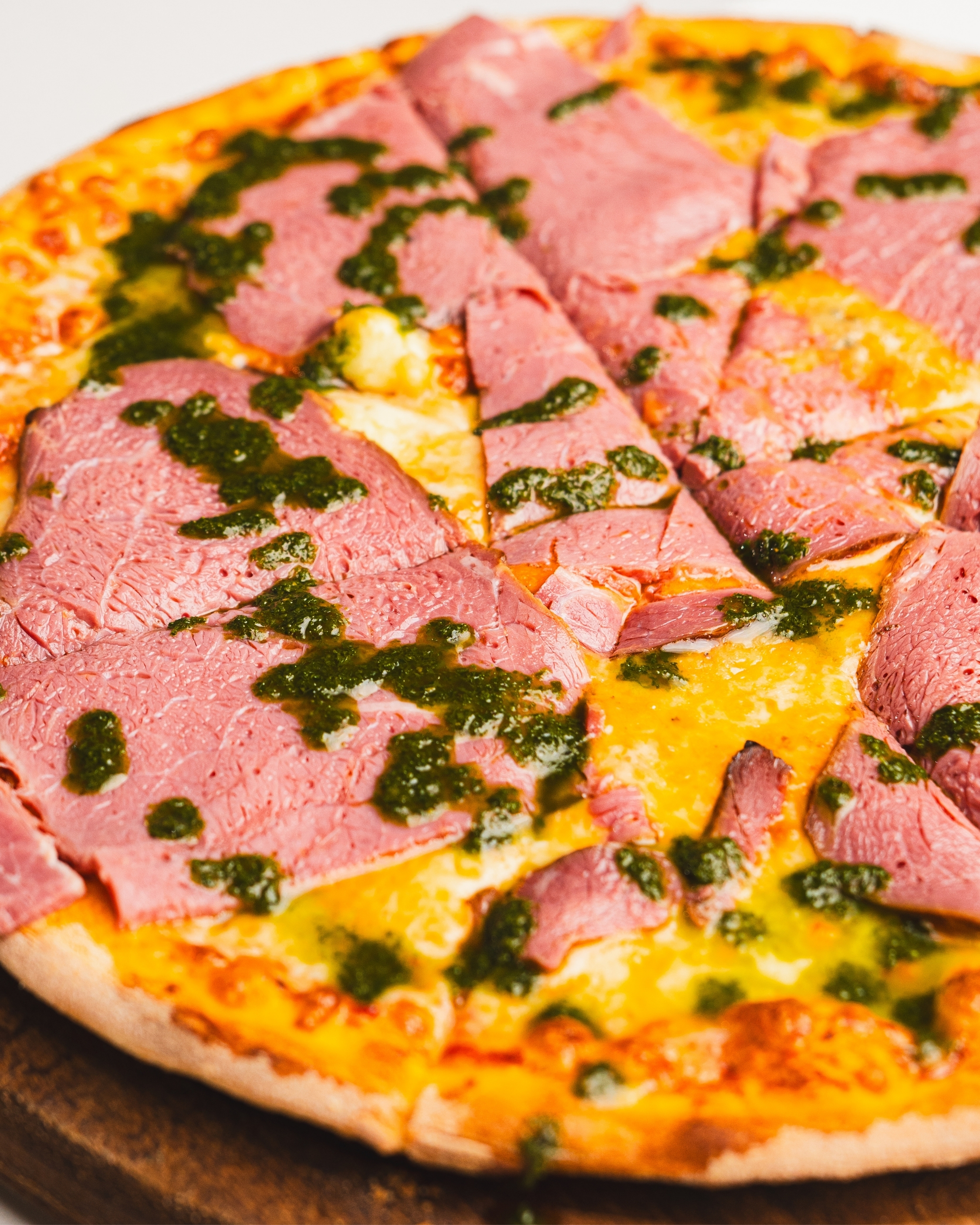Füme kaburga :) Ben etçiyim, füme kaburga da çok uyuyor bana. Pizzaya da çok yakıştırıyorum açıkçası. Bizim çocukluğumuz böyle geçti; ekmek arası döner, Adana dürüm… Hamburger dediğinde aslında hani ekmek arası köfte. Çocukluğumuzdan beri hamur ve eti birleştirdik. Pizzada da füme kaburga bana daha çok uyuyor.
