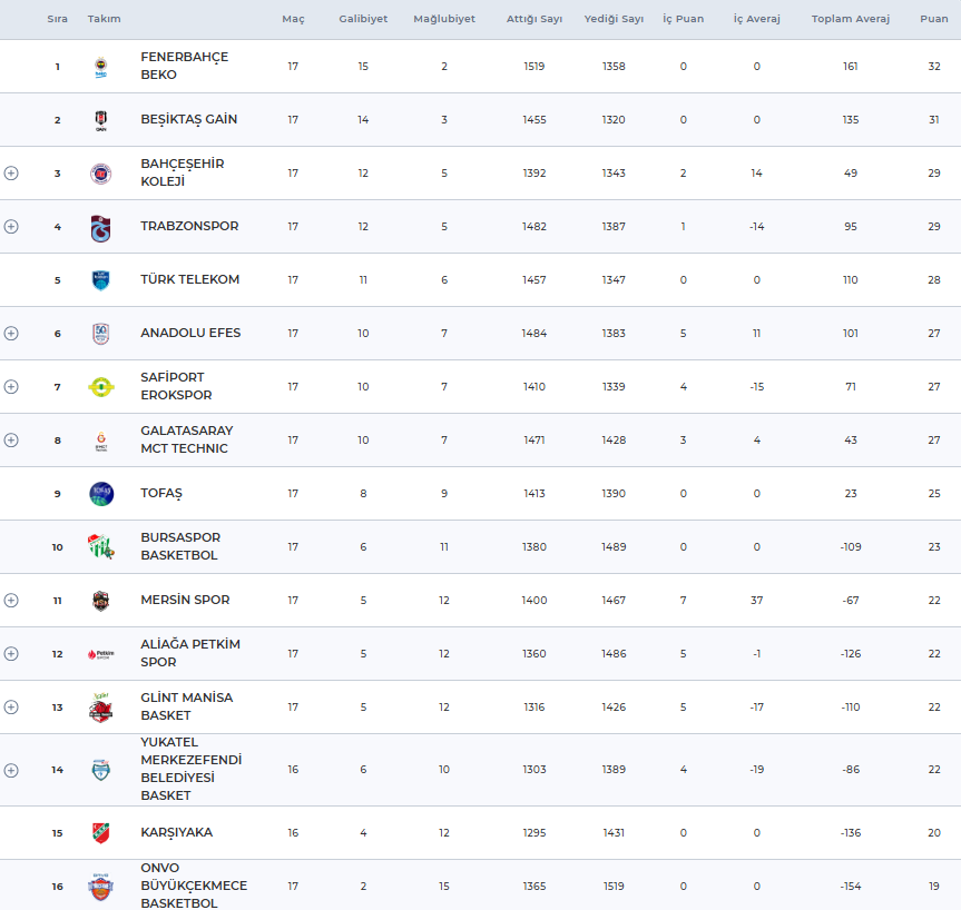 Türkiye Sigorta Basketbol Süper Lig'te Fenerbahçe zirvedeki yerini korurken Beşiktaş Gain'in takibi devam ediyor. Lig'te 17.haftanın sonucunda oluşan puan durumu ise şu şekilde:
