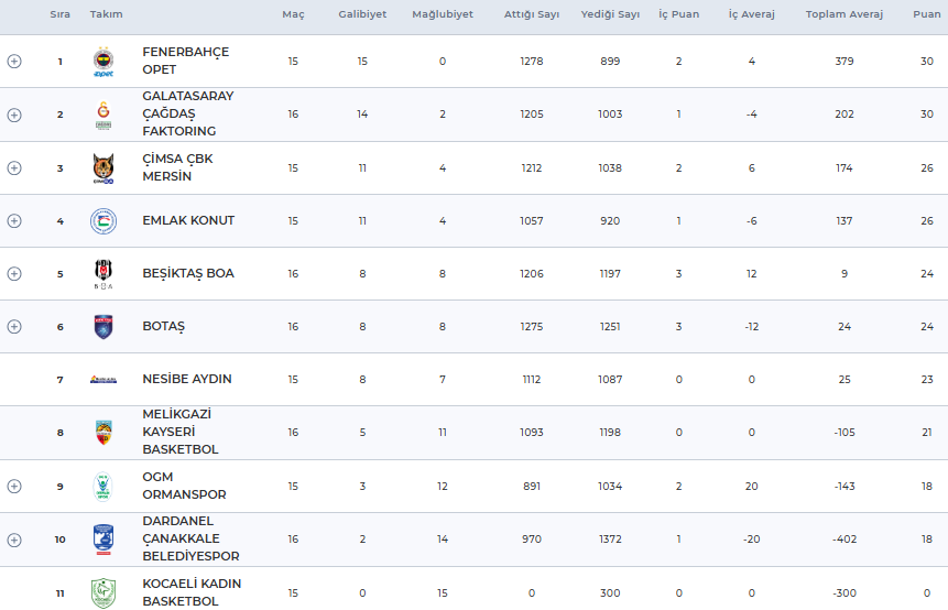 Halkbank Kadınlar Basketbol Süper Lig'de Fenerbahçe Opet ve Galatasaray Çağdaş Faktoring'in 30'ar puanı bulunuyor. Bu hafta oynanacak derbi mücadelesi ligin yeni liderini belirleyecek. 18.haftada oynanacak maçlardan önce oluşan puan durumu şu şekilde: