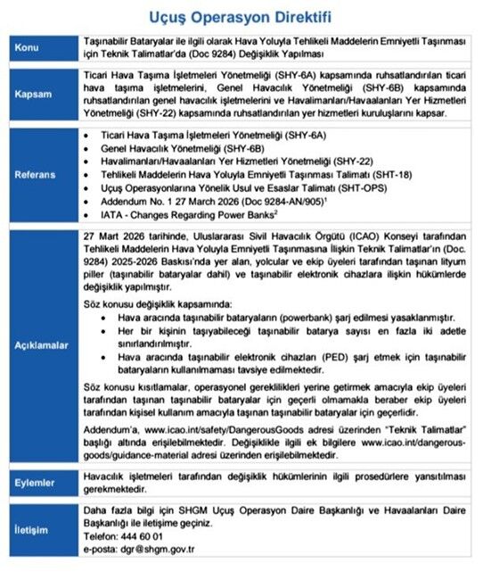 Yayımlanan direktif kapsamında, ICAO’nun teknik talimatlarında yapılan değişikliklerle birlikte yolcu ve ekip üyeleri tarafından taşınan lityum piller ile taşınabilir elektronik cihazlara yönelik yeni kurallar devreye alındı. Konuyla ilgili direktif, SHGM'nin web sayfası üzerinden belge şeklinde yayımlandı.