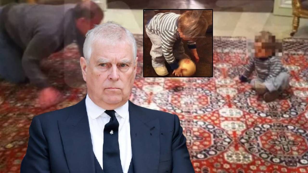 Epstein belgeleri arasından çıkan fotoğrafta eski Prens Andrew'in küçük bir çocukla halının üzerinde oyun oynadığı ve göğüs şeklinde bir topun çocuğun ellerinde olduğu görülüyor.