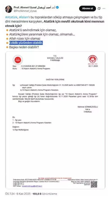 Kocaeli Müftülüğü'nün Atatürk'ün 87'nci ölüm yıl dönümü sebebiyle 10 Kasım'da il genelindeki tüm camilerde mevlit okunacağını açıklamasının ardından Prof. Dr. Ahmet Uysal tepki gösterdi.