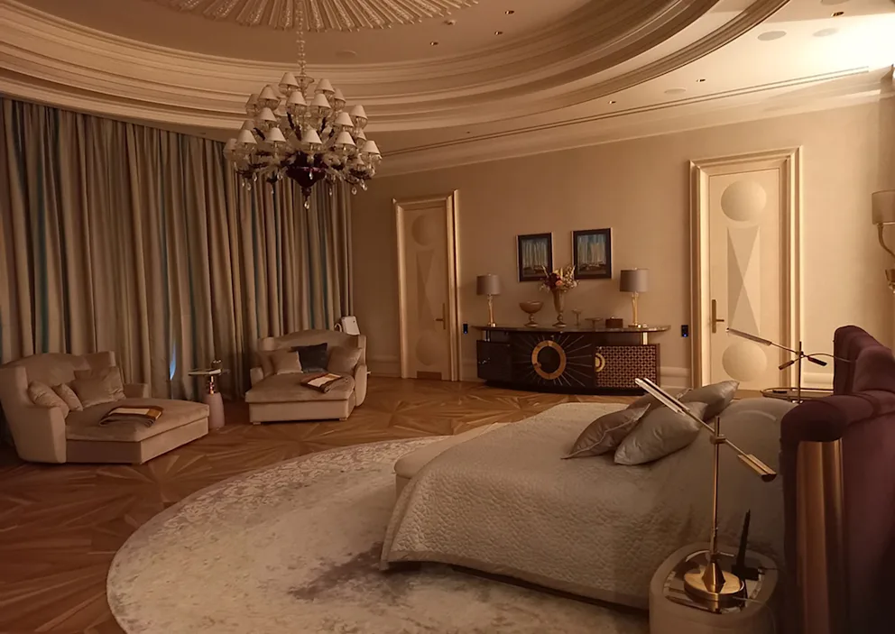 Yatak odası, üç standart iki odalı dairenin toplam alanına eşdeğer büyüklükte. Altın kaplama bir merdivenden çıkarak, yine altın bir korkuluğa tutunup altın bir jakuziye ulaşmak mümkün; Araştırmacılara göre çiçek motifleriyle tasarlanmış banyo aksesuarlarının değeri tek başına yaklaşık 32 bin euro.