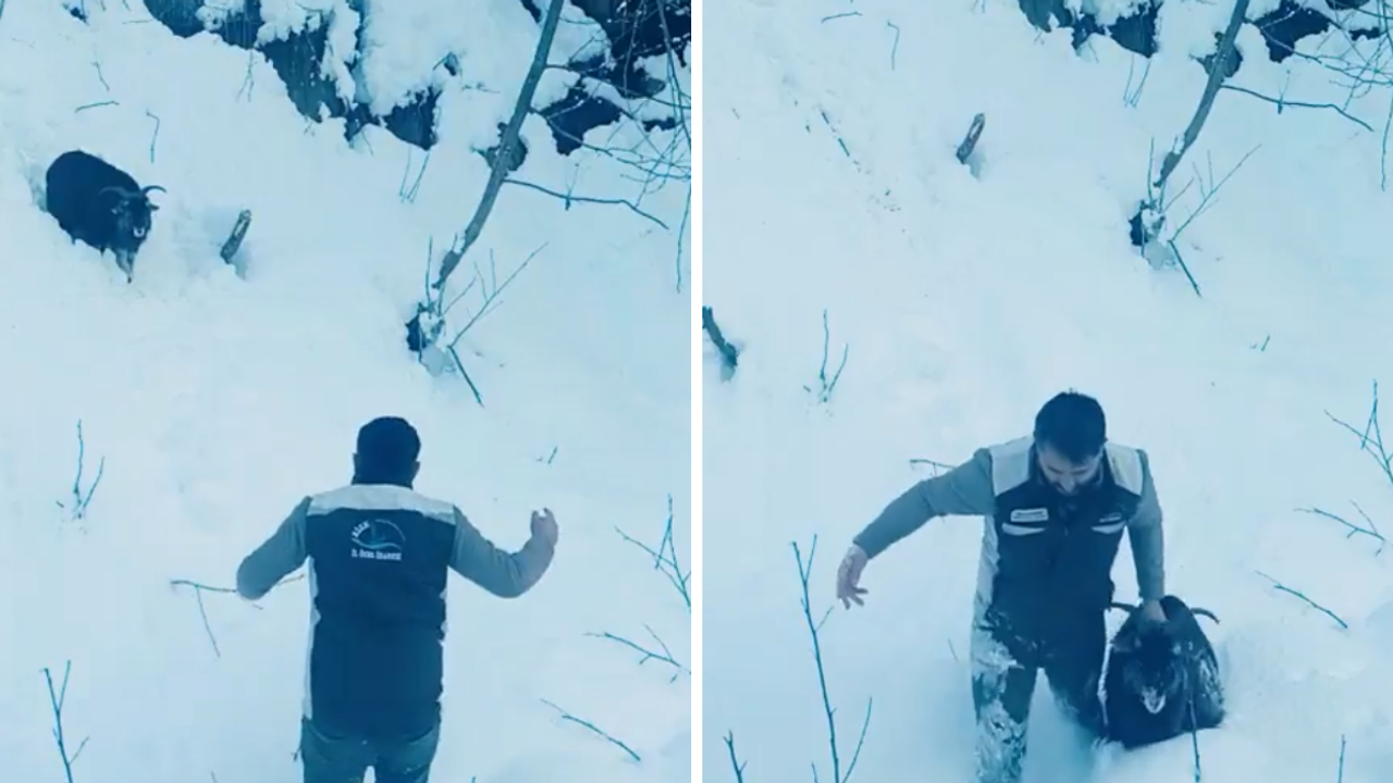 Bölgede kar küreme çalışması yürüten iş makinesi operatörü Muharrem Dedecan, beyaz örtünün arasında hareket eden bir karartı fark etti. İş makinesini durduran Dedecan, karların arasına sıkışmış ve hareket edemeyen bir keçi olduğunu gördü.