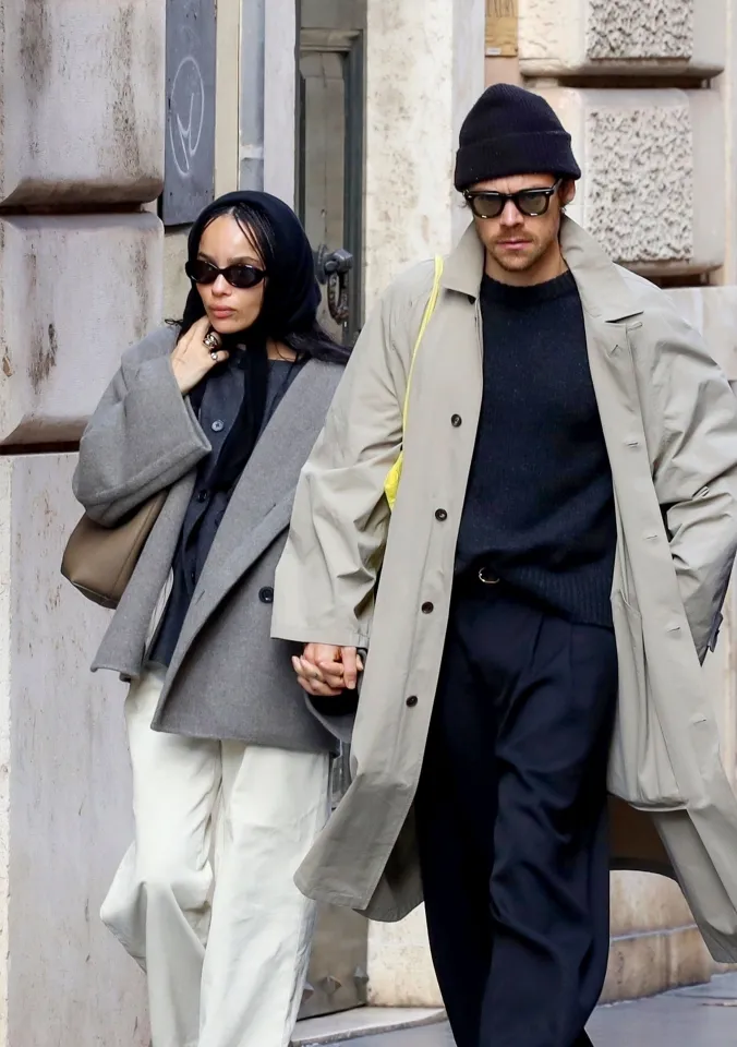 Harry Styles ise bej trençkot, siyah kazak ve pantolonuyla her zamanki sade tarzını sürdürdü.