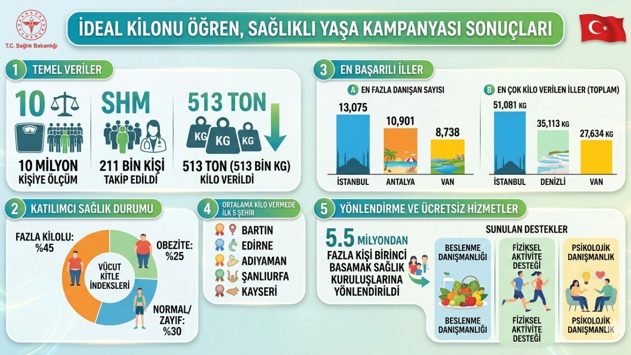 Sağlık Bakanlığı tarafından "İdeal Kilonu Öğren, Sağlıklı Yaşa" kampanyası sonuçları açıklandı. Verilere göre, Sağlıklı Hayat Merkezlerinde (SHM) takiplerini yaptıran yaklaşık 211 bin kişi, yaklaşık 513 bin kilo (513 ton) verdi.
