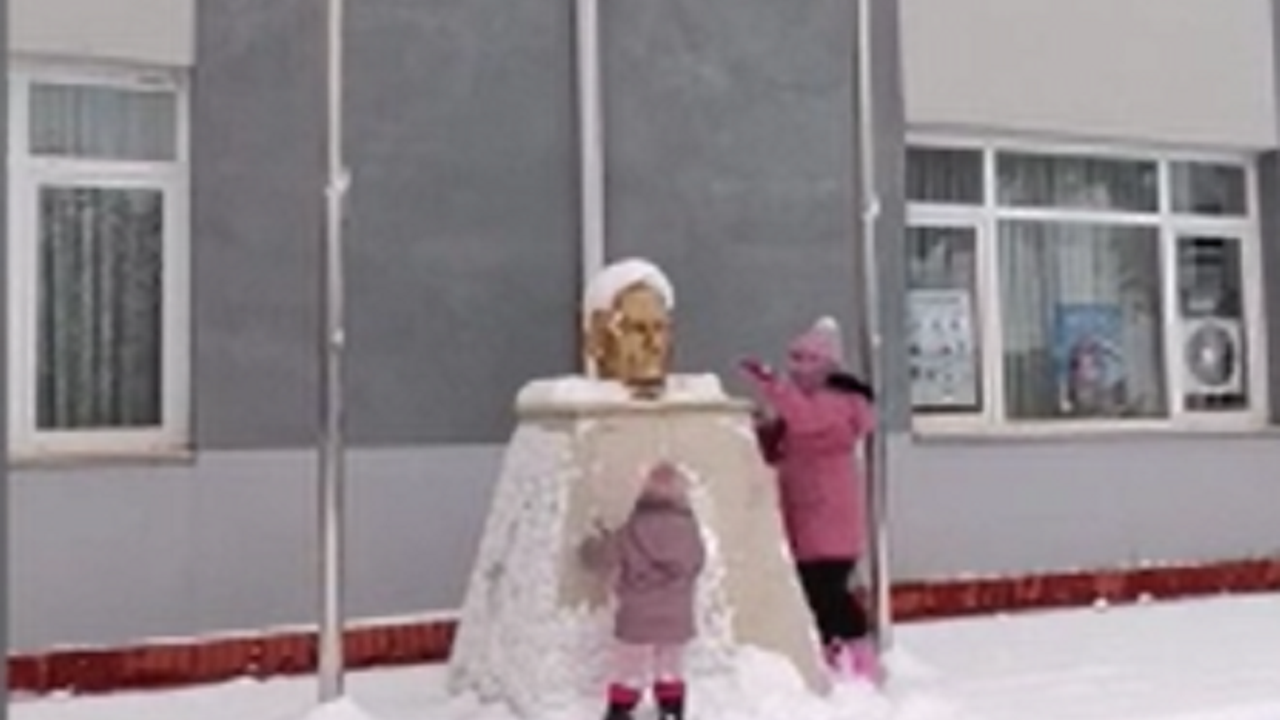 Sakarya'nın Kocaali ilçesinde 2 çocuk okulun bahçesinde karla kapanan Atatürk büstünü temizledi.