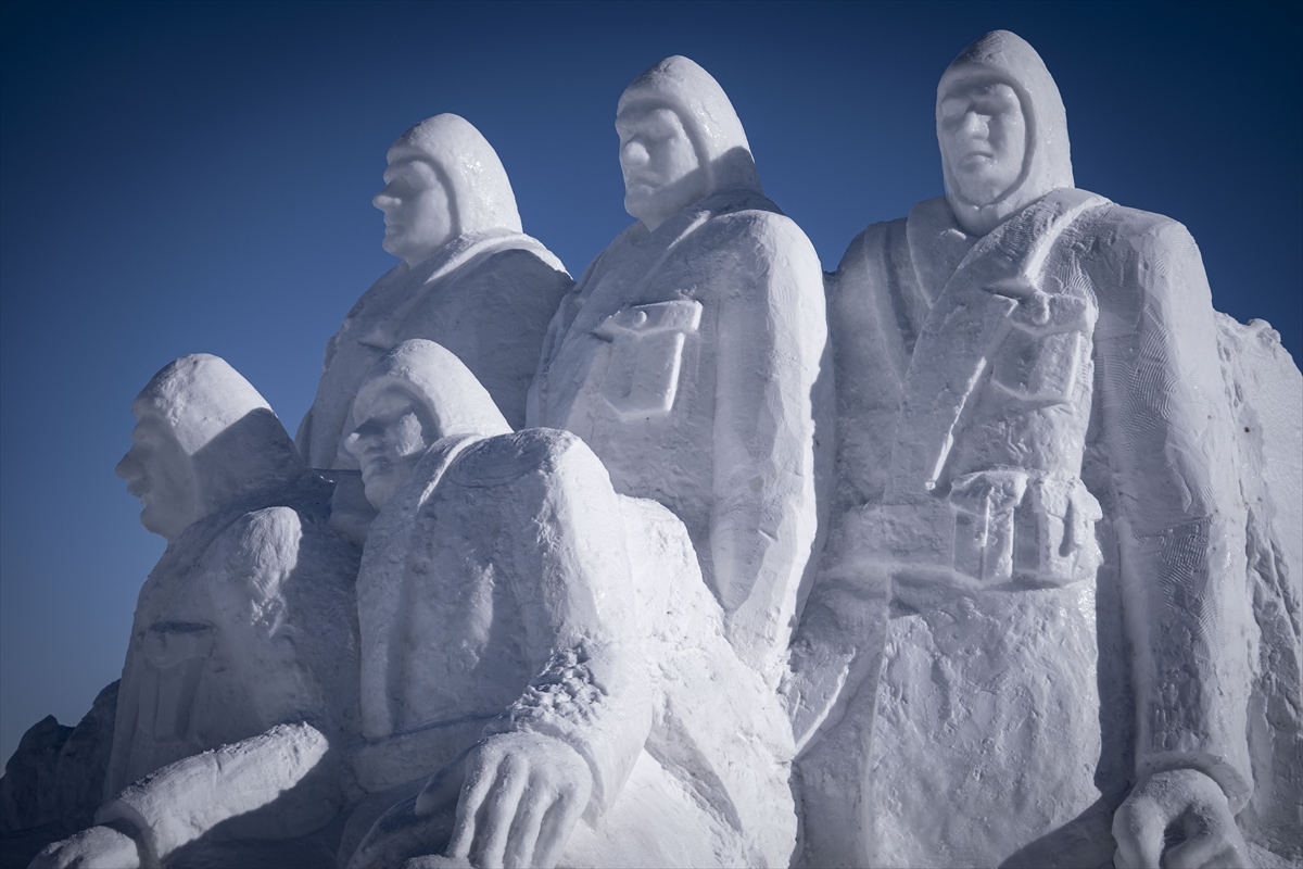 Kars’ta, Sarıkamış Harekatı’nın 111. yılı anma etkinliklerinde kardan yapılan heykeldeki Türk bayrağı, karanfillerle donatıldı.