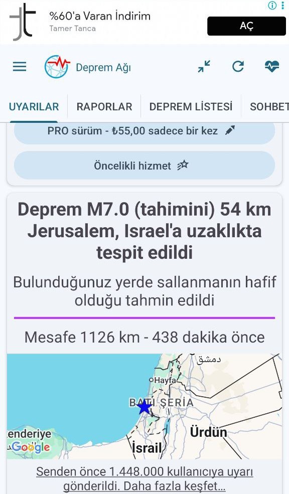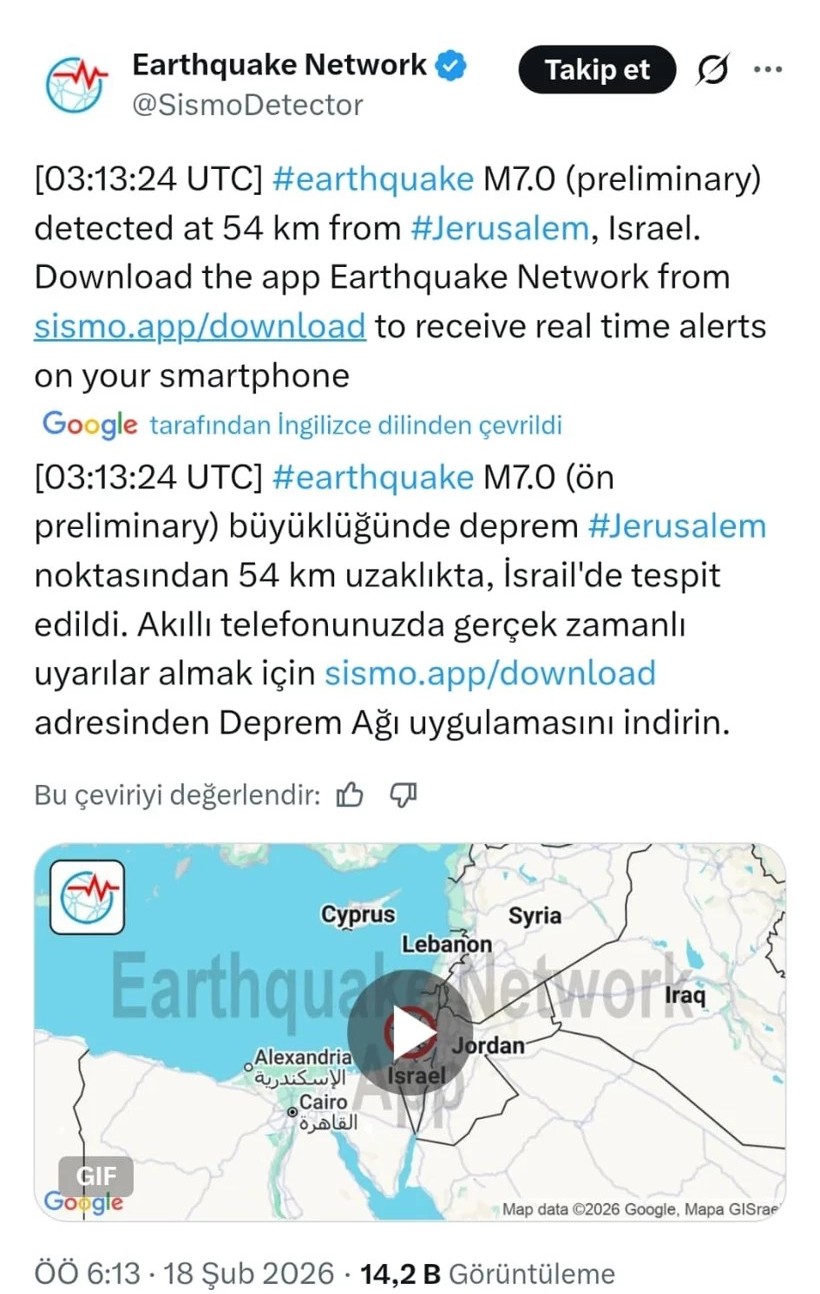İsrail'de herhangi bir sarsıntı yaşanmamasına rağmen, Google'ın deprem uyarı sistemi üzerinden Türkiye ve Yunanistan’daki akıllı telefon kullanıcılarına gönderilen "7.0 büyüklüğünde deprem" bildirimi büyük bir kaosa neden oldu. Kaynağı İsrail olarak gösterilen ancak bölgede hiçbir karşılığı olmayan bu "hayalet" uyarı, komşu ülkelerde sabahın erken saatlerinde korku dolu anlar yaşattı.