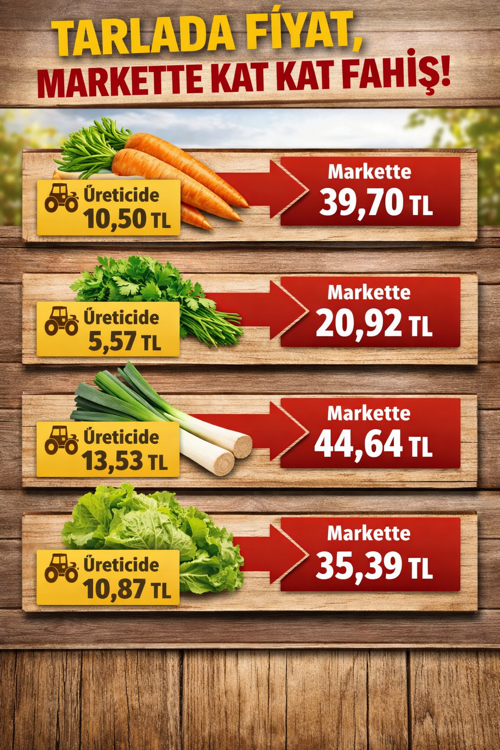 Bayraktar’ın paylaştığı verilere göre, ocakta üretici ile market arasındaki fiyat farkı en fazla yüzde 278,1 ile havuçta görüldü. Havuçtaki uçurumu yüzde 275,8 ile maydanoz, yüzde 229,8 ile pırasa ve yüzde 225,7 ile marul izledi. Bu ürünler markette 3,3 ila 3,8 kat daha pahalıya satıldı.