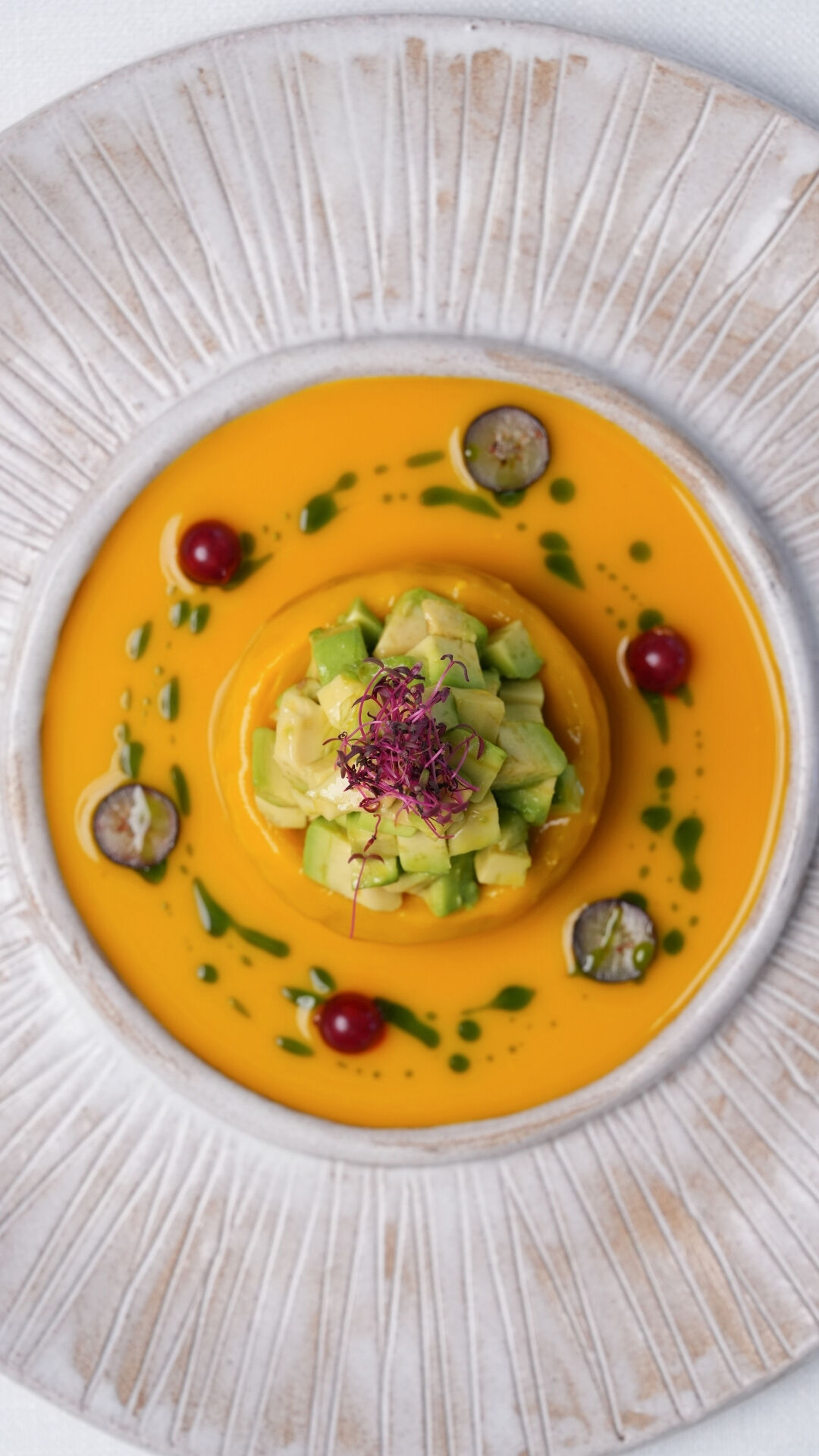 Avokadoyu küçük küpler halinde doğrayın ve hafifçe lezzetlendirerek enginarların üzerine yerleştirin. Mikro filizleri üzerine serpiştirin. Tabağın çevresini frenk üzümü ve yaban mersini ile dengeleyin.