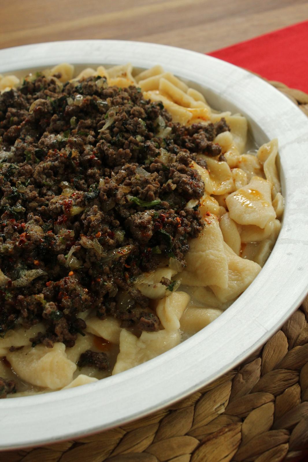 Haşlanmış hamurları tabağa alın, üzerine kavrulmuş kıymayı ve kıyılmış maydanozu ekleyerek mantıyı servis edin.