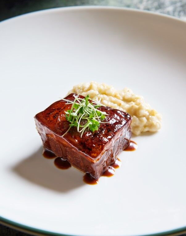 Keşkeği tabağın tabanına yayın. Üzerine kemikten ayrılmış dana kaburgayı yerleştirin.