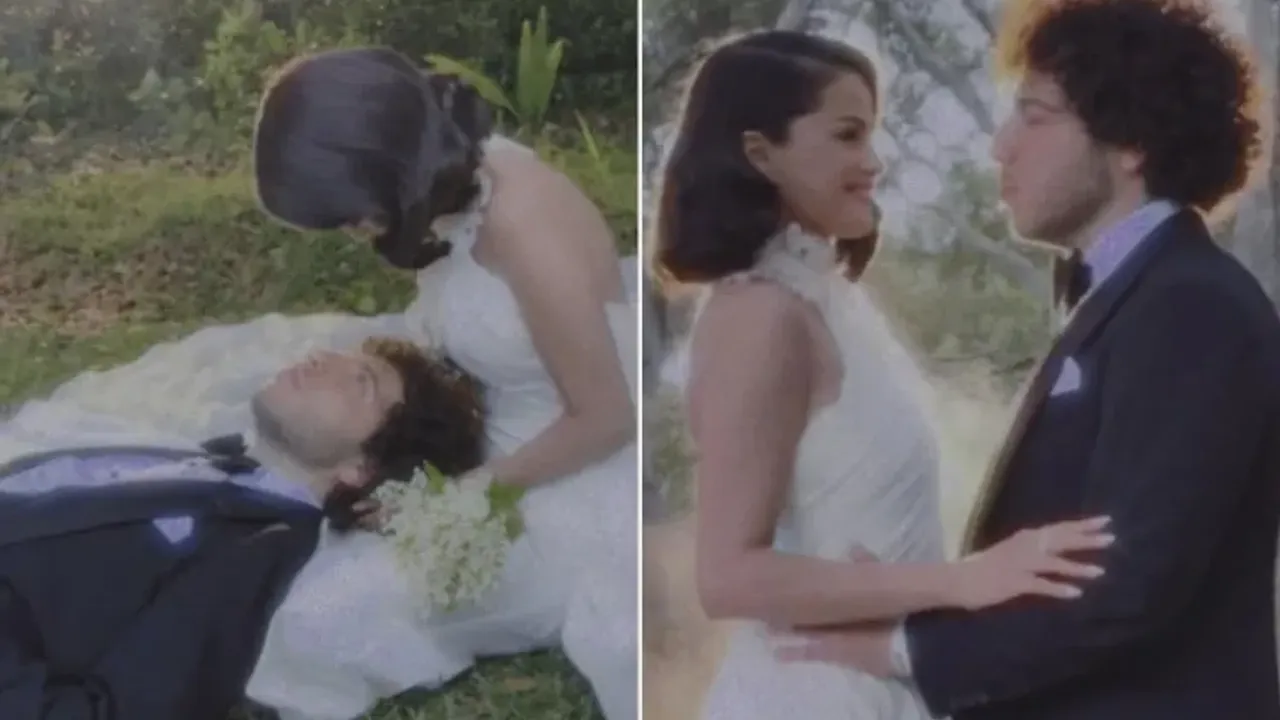 Gomez, çiçek desenli askılı korse ve çarpıcı sırt dekoltesine sahip gelinliğiyle büyülerken, Blanco siyah smokin ve papyonuyla şıklığını tamamladı.