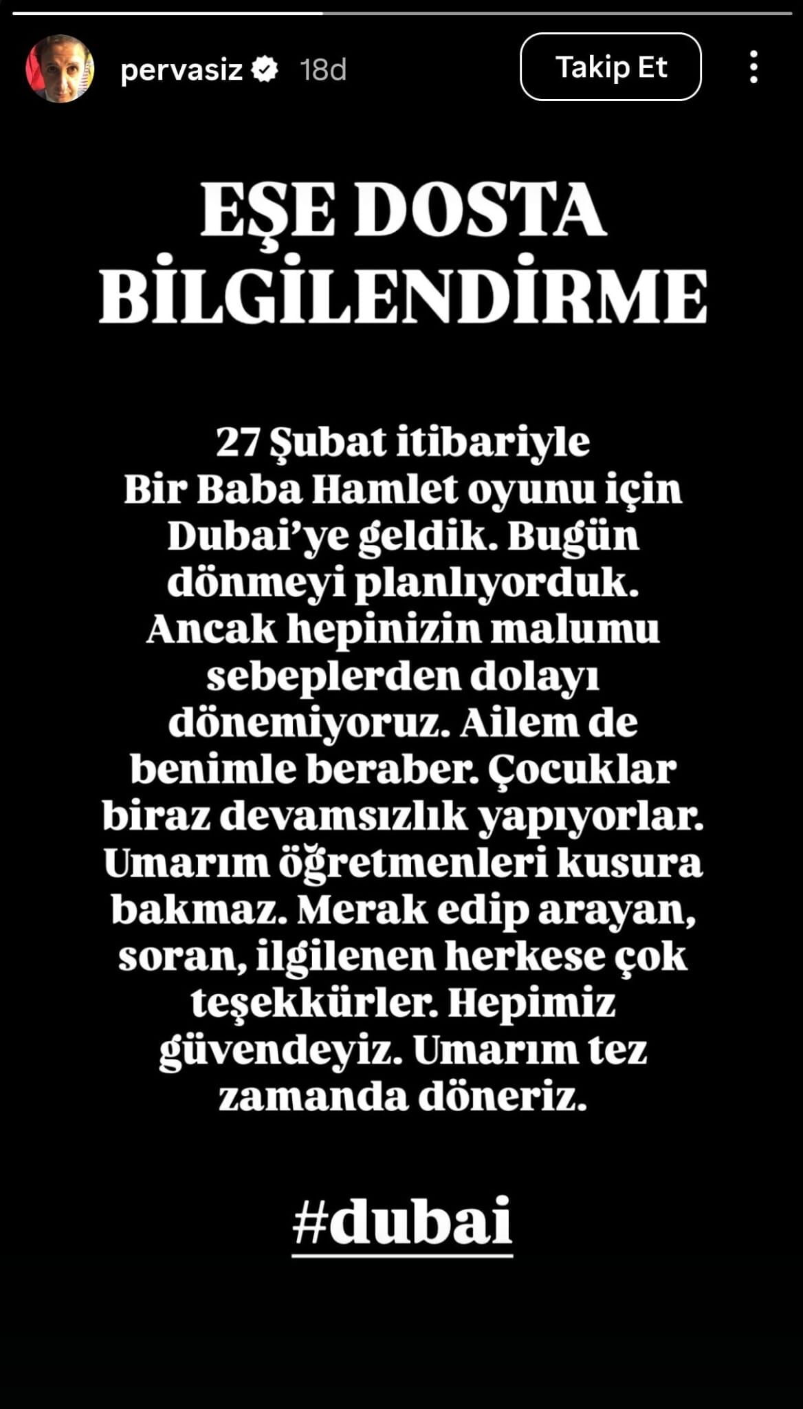 “27 Şubat itibariyle Bir Baba Hamlet oyunu için Dubai’ye geldik. Bugün dönmeyi planlıyorduk. Ancak hepinizin malumu sebeplerden dolayı dönemiyoruz. Ailem de benimle beraber. Çocuklar biraz devamsızlık yapıyorlar. Umarım öğretmenleri kusura bakmaz. Merak edip arayan, soran, ilgilenen herkese çok teşekkürler. Hepimiz güvendeyiz. Umarım tez zamanda döneriz.”