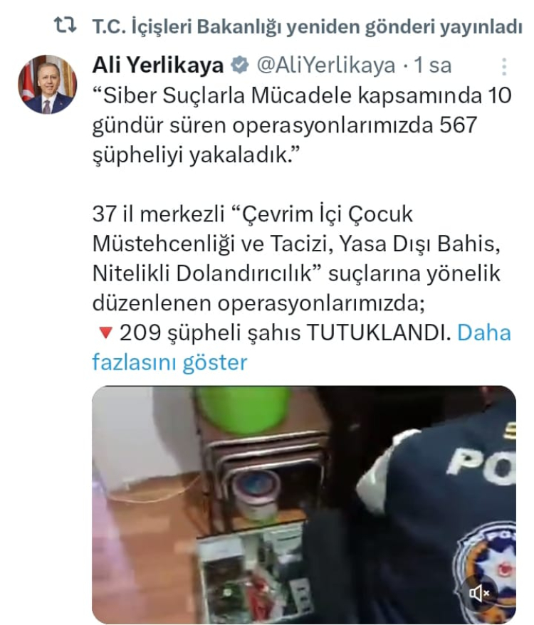 Bakan Yerlikaya, Sosyal hesabından yapmış olduğu açıklamada, 37 ilde "çevrim içi çocuk müstehcenliği ve tacizi", "nitelikli dolandırıcılık", "yasa dışı bahis" suçlarına yönelik operasyonlarda son 10 günde 567 şüpheliden 209''unun tutuklandığını, 112''si hakkında adli kontrol hükümlerinin uygulandığını, diğerlerinin işlemlerinin devam ettiğini belirtti.
