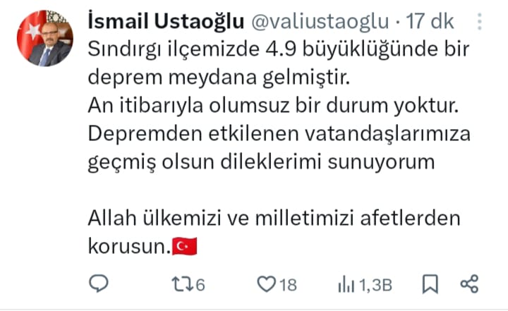 "Sındırgı ilçemizde 4,9 büyüklüğünde bir deprem meydana gelmiştir. An itibarıyla olumsuz bir durum yoktur. Depremden etkilenen vatandaşlarımıza geçmiş olsun dileklerimi sunuyorum. Allah ülkemizi ve milletimizi afetlerden korusun." Diyerek geçmiş olsun mesajı gönderdi.