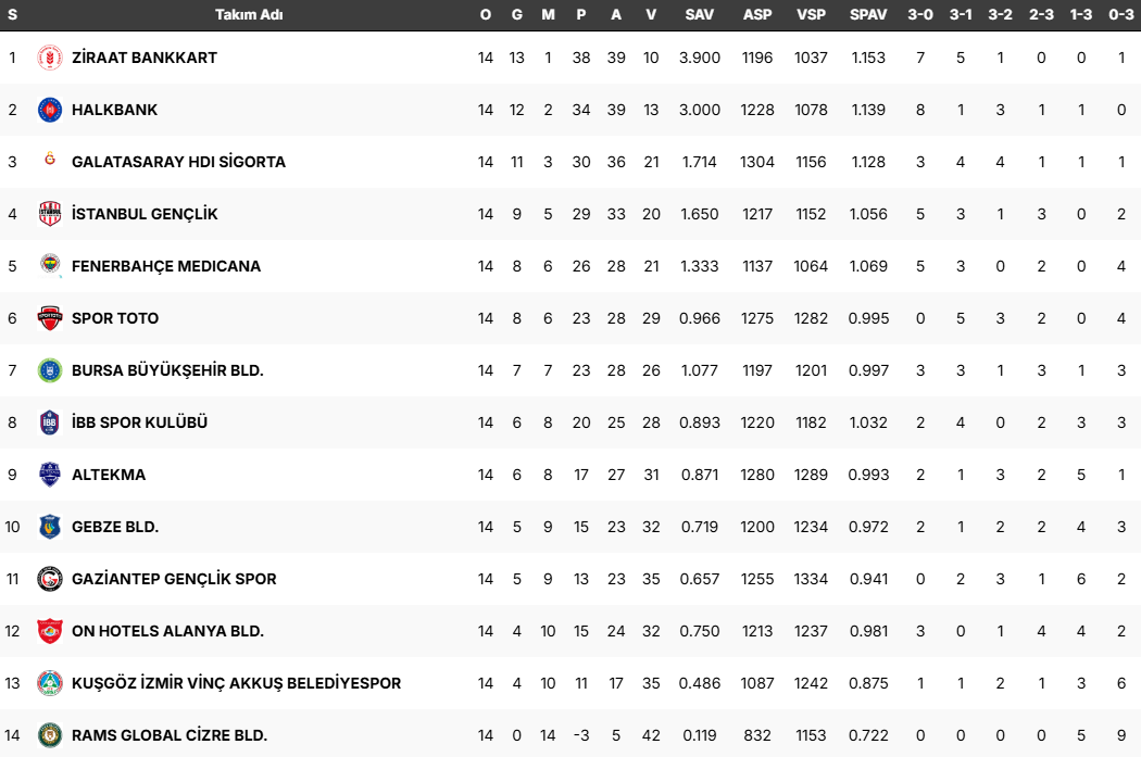 SMS Grup Efeler Ligi'nde Ziraat Bankkart 38 puanla liderliğini sürdürüyor. Lig'de 15.hafta oynanacak yedi karşılaşma ile tamamlanacak. Maçlar öncesi puan tablosu ise şöyle:
