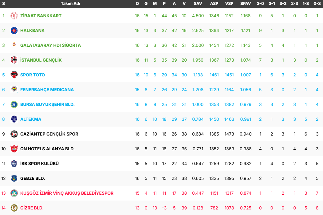 SMS Grup Efeler Ligi'nde Ziraat Bankkart liderliğini sürdürüyor. 17. hafta oynanacak mücadelelerden önce oluşan puan durumu şu şekilde: