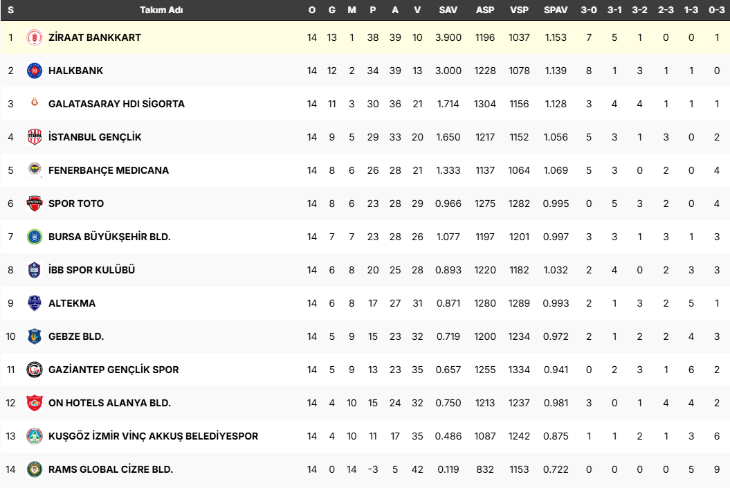 SMS Grup Efeler Ligi'nde 15. hafta pazar günü oynanan yedi mücadele ile tamamlandı. Lider Ziraat Bankkart haftayı kayıpsız geçerken, Halkbank zirve takibini sürdürdü. SMS Grup Efeler Ligi'nde maçlarından ardından oluşan puan tablosu şu şekilde: