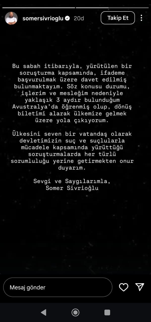 Şef Sivrioğlu şu ifadeleri kullandı: "Bu sabah itibarıyla, yürütülen bir soruşturma kapsamında, ifademe başvurulmak üzere davet edilmiş bulunmaktayım. Söz konusu durumu, işlerim ve mesleğim nedeniyle yaklaşık 3 aydır bulunduğum Avustralya’da öğrenmiş olup, dönüş biletimi alarak ülkemize gelmek üzere yola çıkıyorum. Ülkesini seven bir vatandaş olarak devletimizin suç ve suçlularla mücadele kapsamında yürüttüğü soruşturmalarda her türlü sorumluluğu yerine getirmekten onur duyarım."