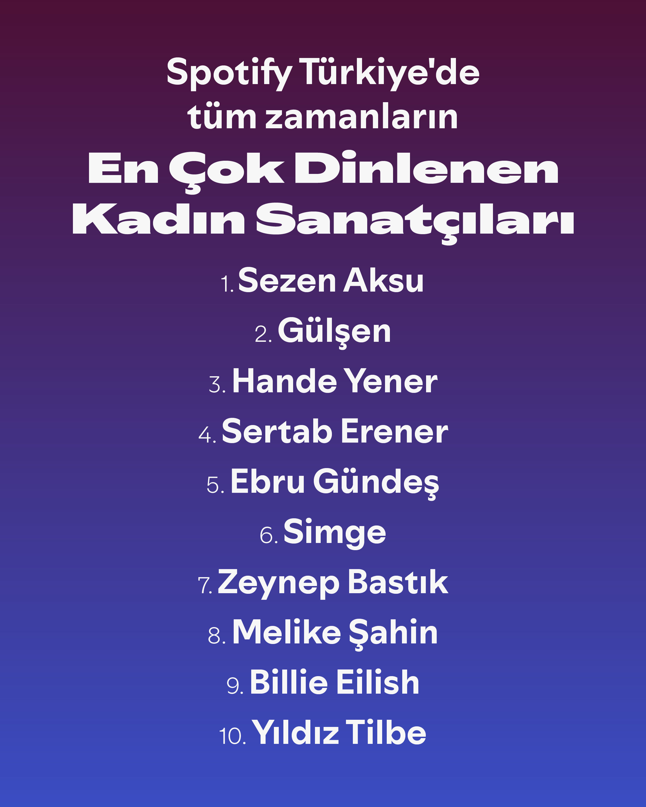 Listenin devamında ise farklı müzikal tarzları temsil eden isimler bulunuyor. Altıncı sırada Simge yer alırken, onu uluslararası listelerde de görünürlük kazanan Zeynep Bastık izliyor. Şarkıcı-söz yazarı kimliğiyle öne çıkan Melike Şahin sekizinci sırada yer alırken, Billie Eilish Türkiye listesinde ilk 10’a giren tek global kadın sanatçı olarak dikkat çekiyor. Listeyi, uzun yıllardır dinleyicilerle buluşan şarkılarıyla Yıldız Tilbe tamamlıyor.