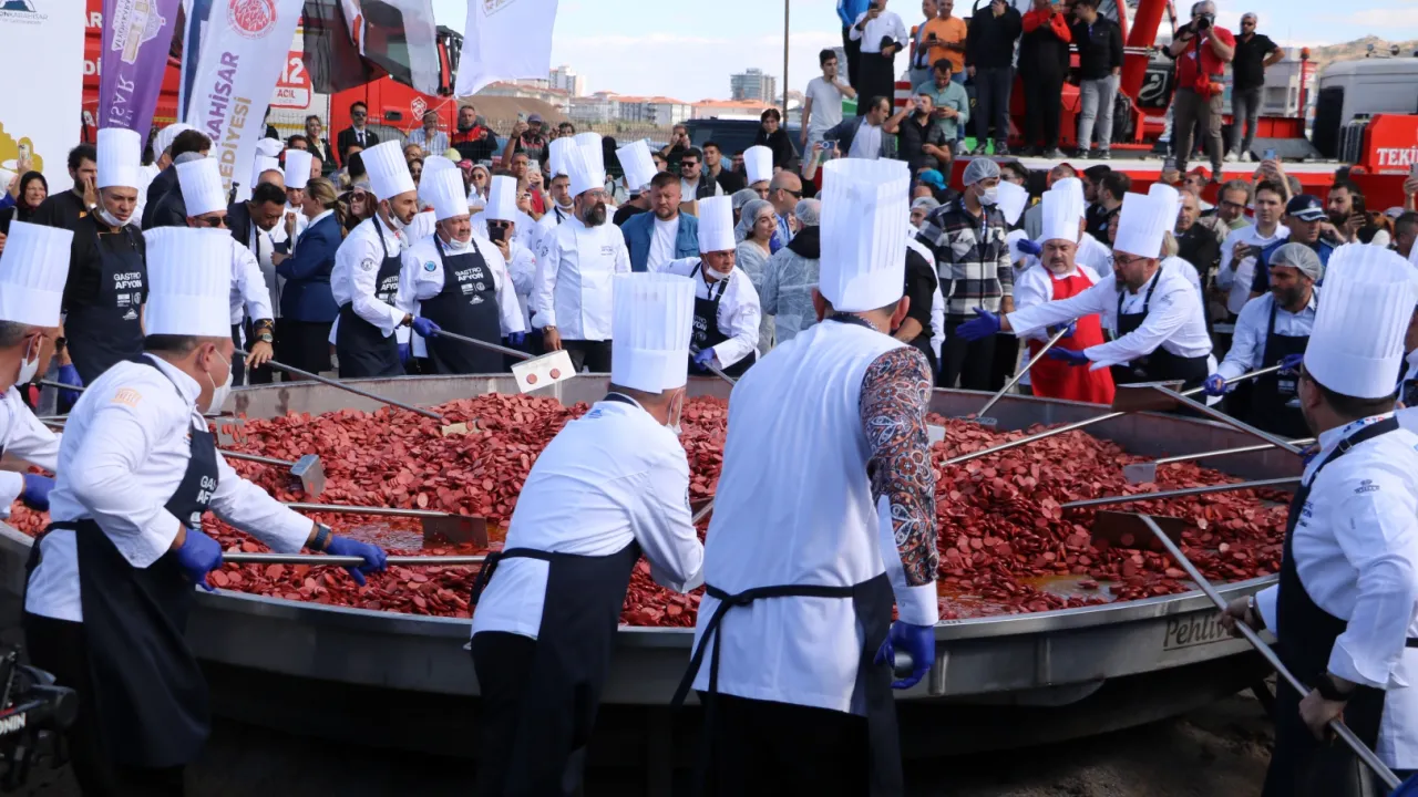 1 ton sucuk ve 15 bin yumurta ile 25 metrekarelik dev tavada 30 şefin hazırladığı sucuklu yumurta Guinness World Records Denetmeni Şeyda Subaşı Gemici''nin gözetiminde pişirildi.