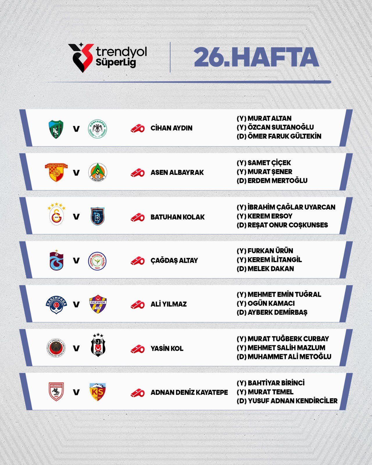 Türkiye Futbol Federasyonu Merkez Hakem Kurulu (MHK) Trendyol Süper Lig’in 26.haftasında görev alacak hakemleri açıkladı.